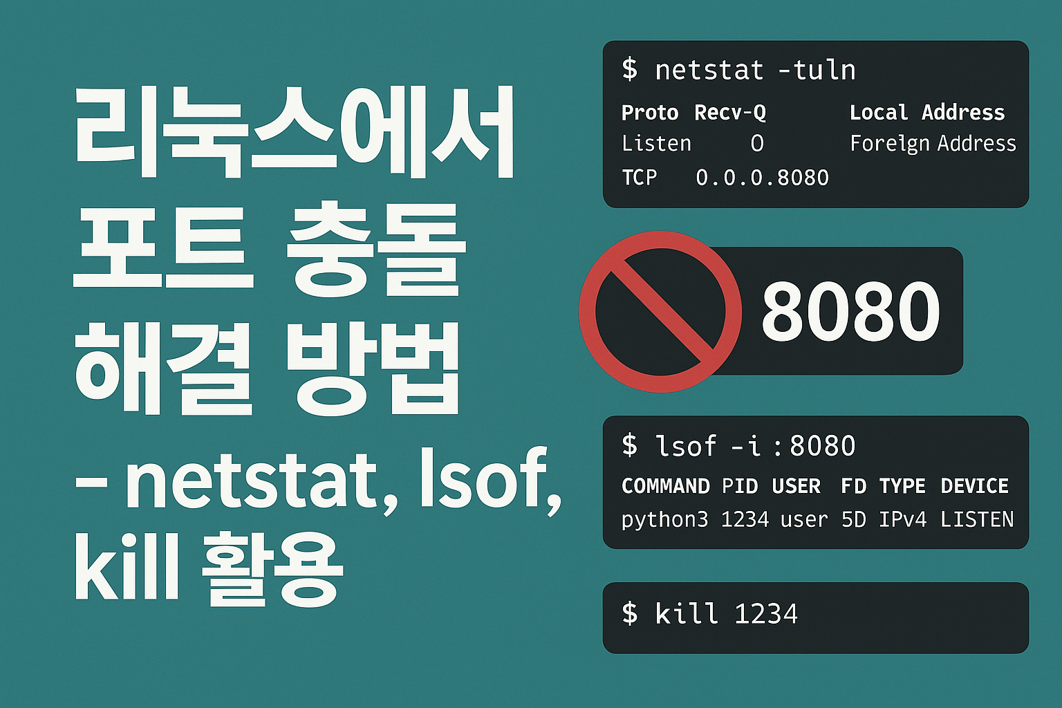 netstat명령어로 사용 중인 포트 확인하기lsof명령어로 포트를 사용하는 프로세스 식별하기kill명령어로 프로세스 종료하기- 실전 예제: 웹 서버 포트 충돌 해결하기