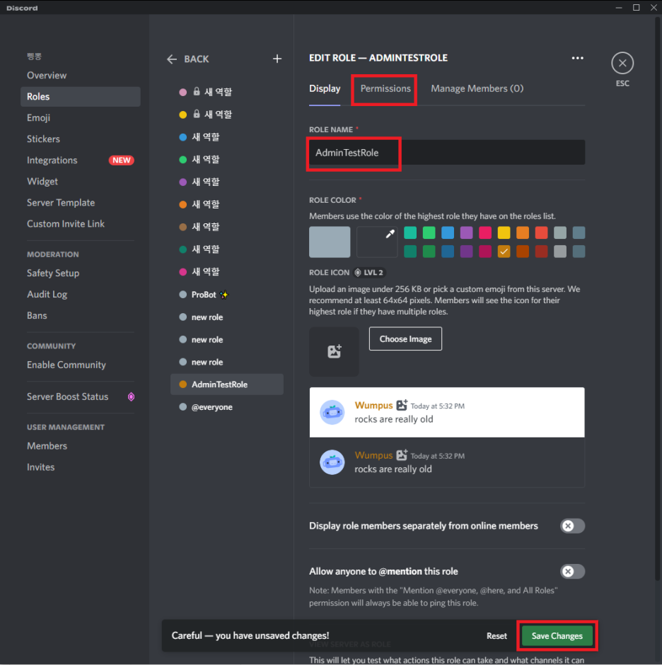 좌측 메뉴에서 "역할" 탭을 클릭하면 현재 서버의 모든 역할을 확인할 수 있습니다.
